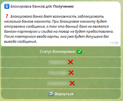 Рис.19. Настройка блокировки банков в Telegram-боте