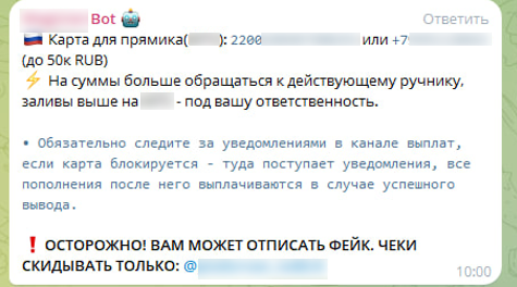В некоторых случаях мошенники даже не создают фишинговые страницы, а просто присылают жертве номер карты, на который предлагают перевести определённую сумму. Эти номера они берут в тех же чатах скам-группы или боте.