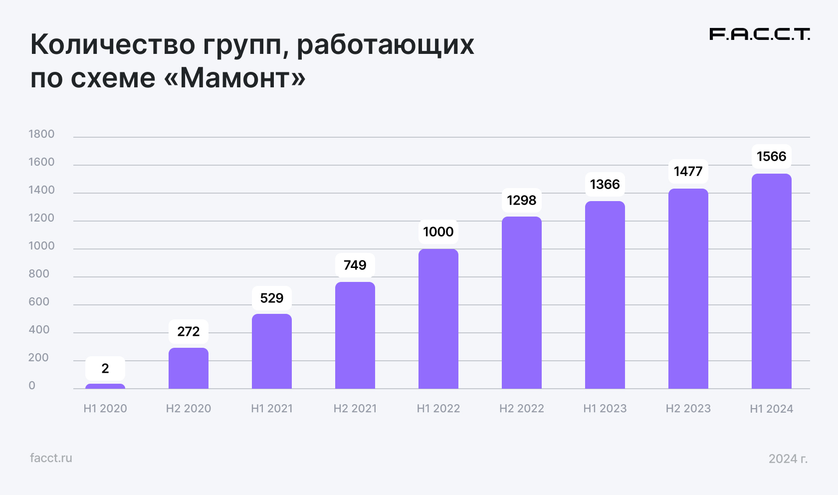 Нам известно о 1 566 различных группах, как работающих по схеме «Мамонт» в настоящее время, так и прекративших свою активность, которые были созданы с начала 2020 года по первую половину 2024-го. Большинство таких групп долго не «живут», но взамен закрывшихся сразу же появляются новые.