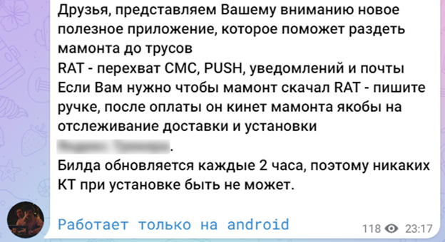 В стремлении увеличить свой доход злоумышленники придумывают новые способы доставить на устройства пользователей вредоносные приложения. ВПО позволяет списывать деньги со всех банковских счетов жертвы и оформлять на неё кредиты, минимизируя при этом риски автоматической блокировки карты из-за подозрительных действий. Ещё в 2023 году мы отмечали распространение некоторыми мошенническими группами RAT (Remote Access Trojan, или троян удалённого доступа) для заражения устройств пользователей на Android. За год злоумышленники сократили путь доставки «трояна» до одного клика.