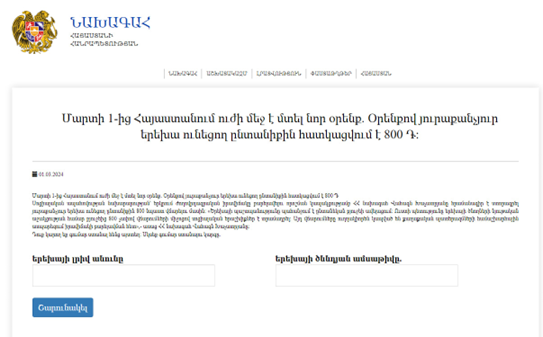Рис.35. Страница с фейковым сообщением для граждан Армении о якобы вступлении в силу закона, который даёт право семьям с детьми на получении выплаты