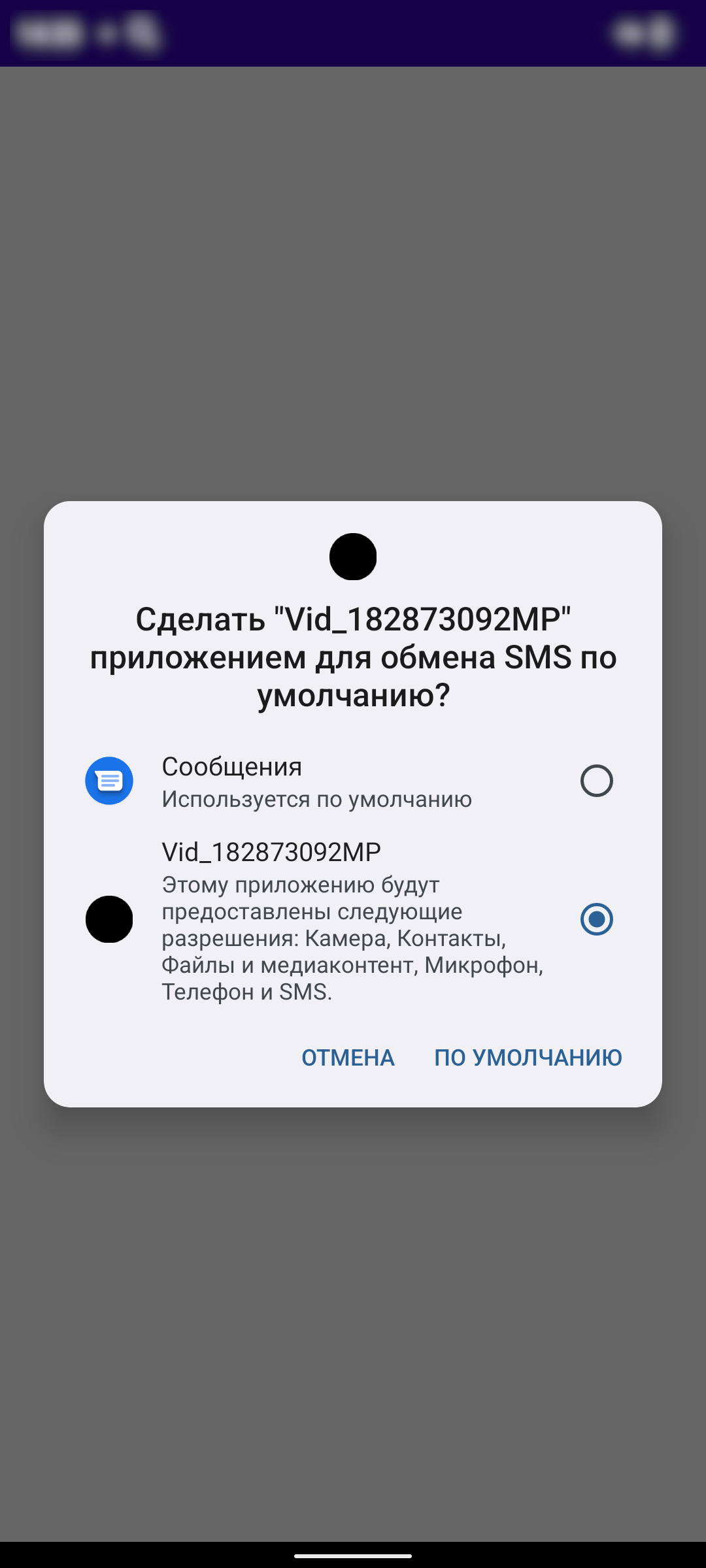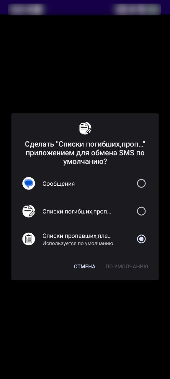 Рисунок 4. Запрос на установку приложения в качестве основного для обмена СМС