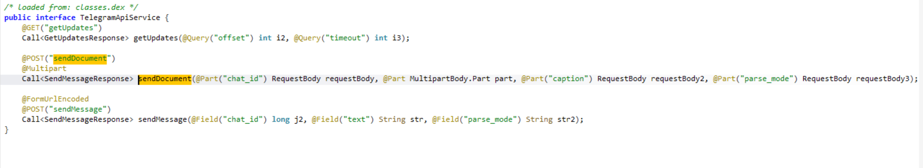 При анализе работы образца вредоносного приложения с Telegram Bot API мы видим, что в образце присутствует возможность работы с такими API Telegram-бота, как: