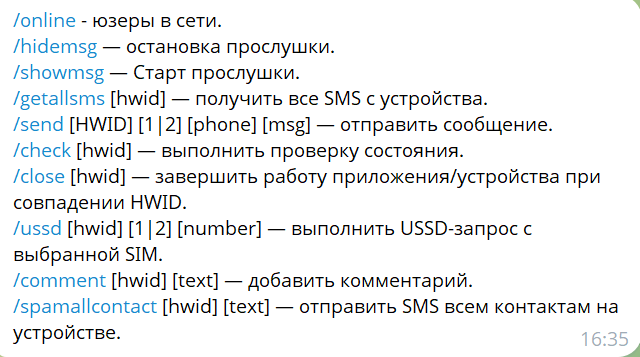Telegram-бот предоставляет полное описание команд для управления вредоносными приложениями: