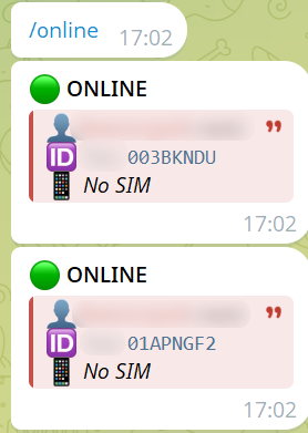 Команда /online позволяет просмотреть подключенные в данный момент устройства, формат ответа выглядит следующим образом.