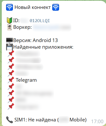 Сразу после запуска исследуемый образец Mamont производит отправку сообщения злоумышленникам об успешном запуске и подключении устройства. В инициализационном сообщении присутствуют такие данные, как: