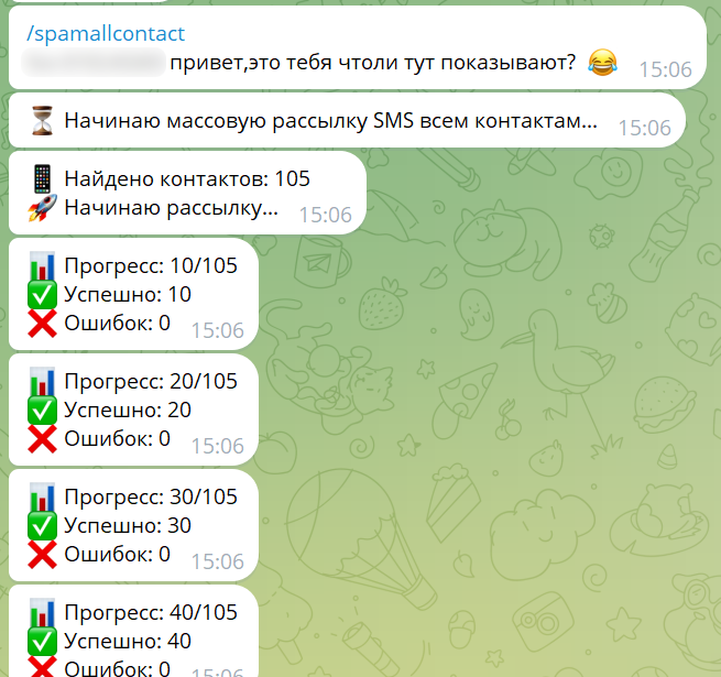 Команда /spamallcontact производит рассылку всем контактам телефонной книги на устройстве жертвы. Таким образом, отправляя данную команду, злоумышленники могут, например, производить дальнейшее распространение ВПО.