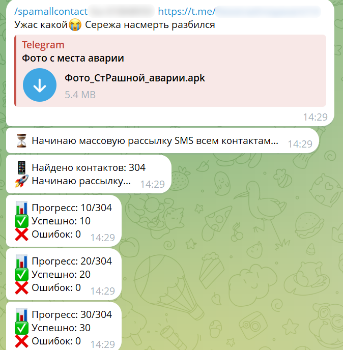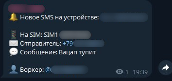 С получением номера телефона пользователя и возможности отправки СМС с его устройства преступники производят дальнейшее распространение вредоносных файлов через встроенный функционал ВПО – рассылают сообщения с ВПО всем контактам жертвы.