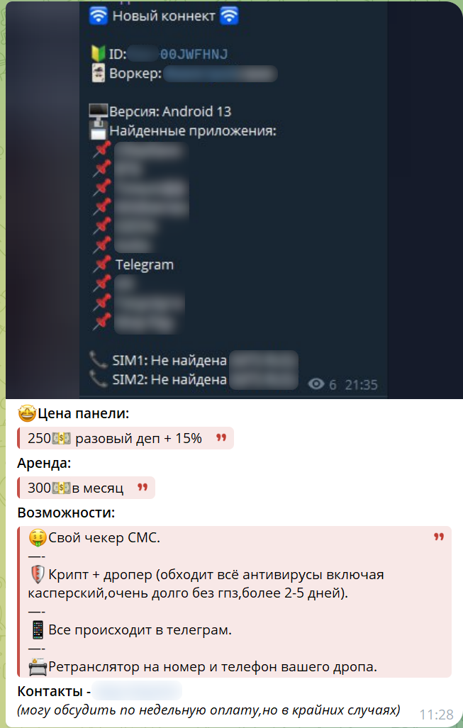 В чате злоумышленников также обнаружено объявление о продаже / аренде панели управления (Telegram-бота), из которого известна цена ВПО: