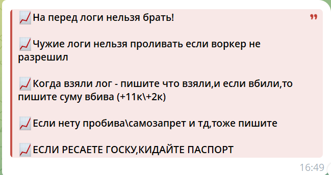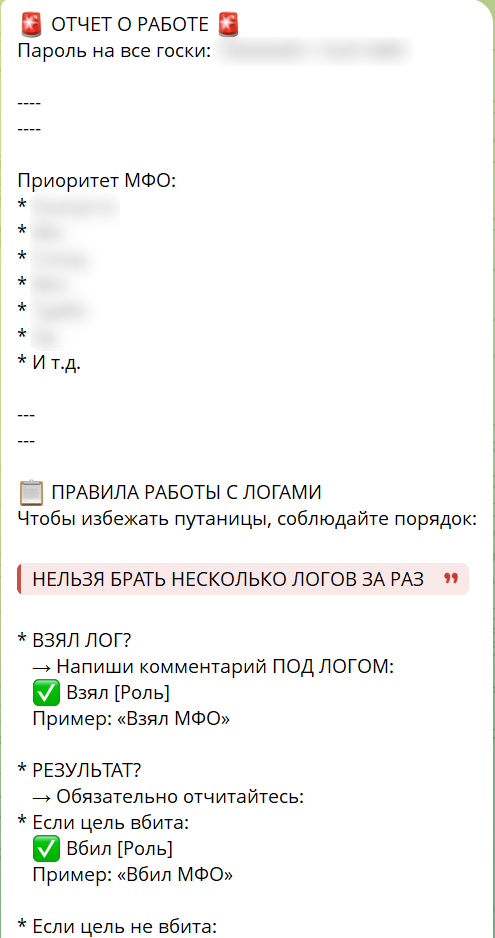 Анализ чата злоумышленников позволил выяснить, как координируются действия внутри преступной команды: присутствуют внутренние правила, разделение обязанностей, приоритеты микрофинансовых организаций, где берутся займы на жертв.