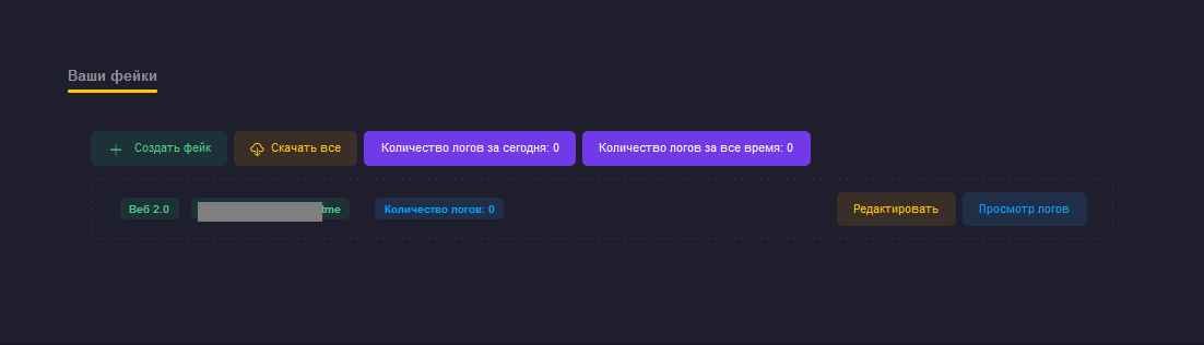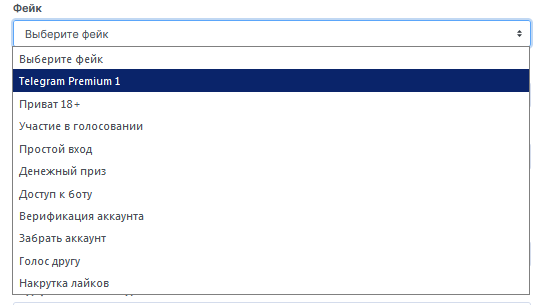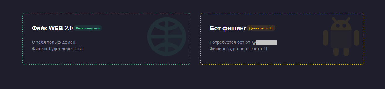 В панели представлена возможность создавать два вида фейков: «фейк web» (фишинговый сайт) и «бот фишинг» (фишинг через Telegram-бота).