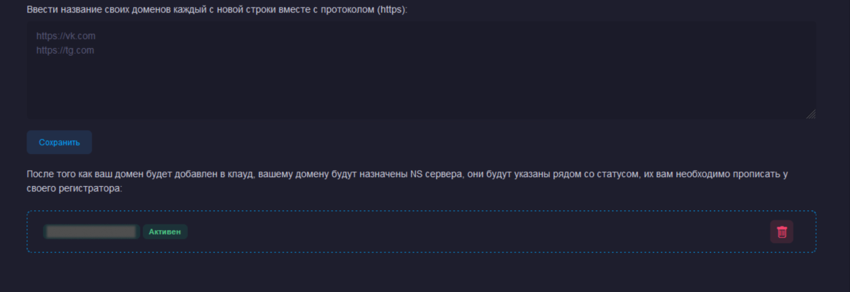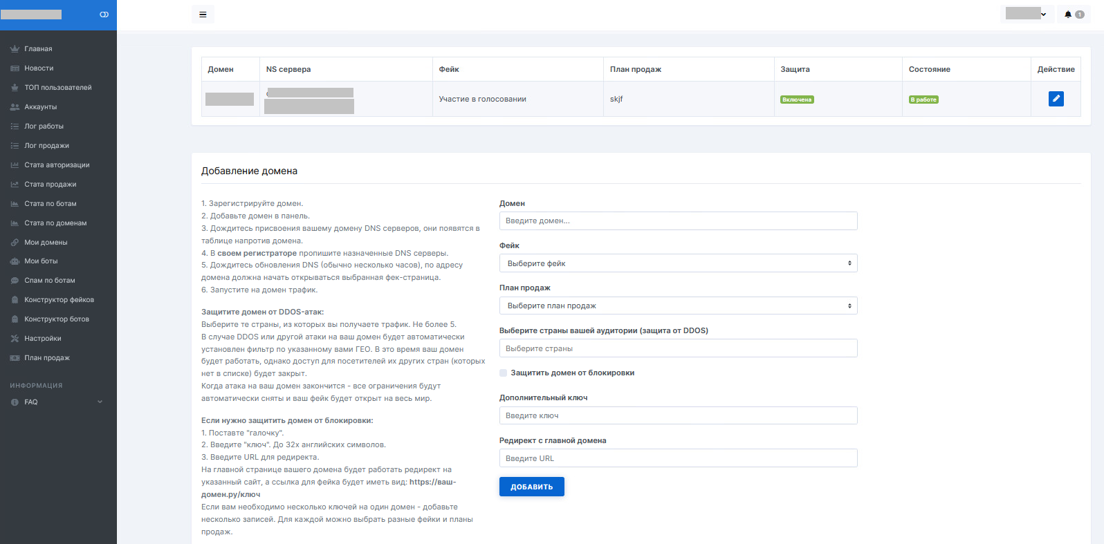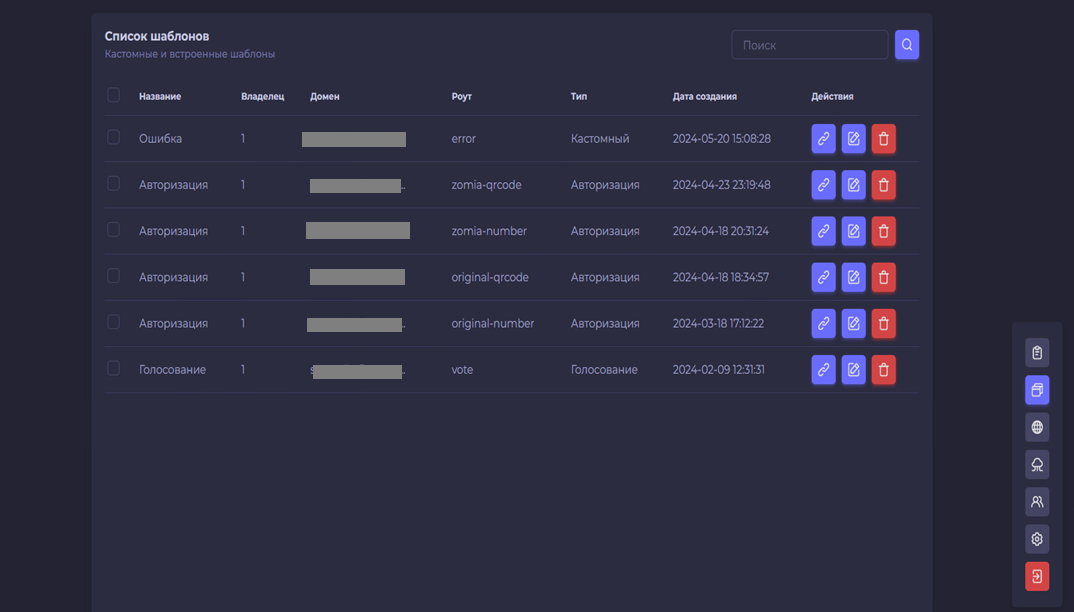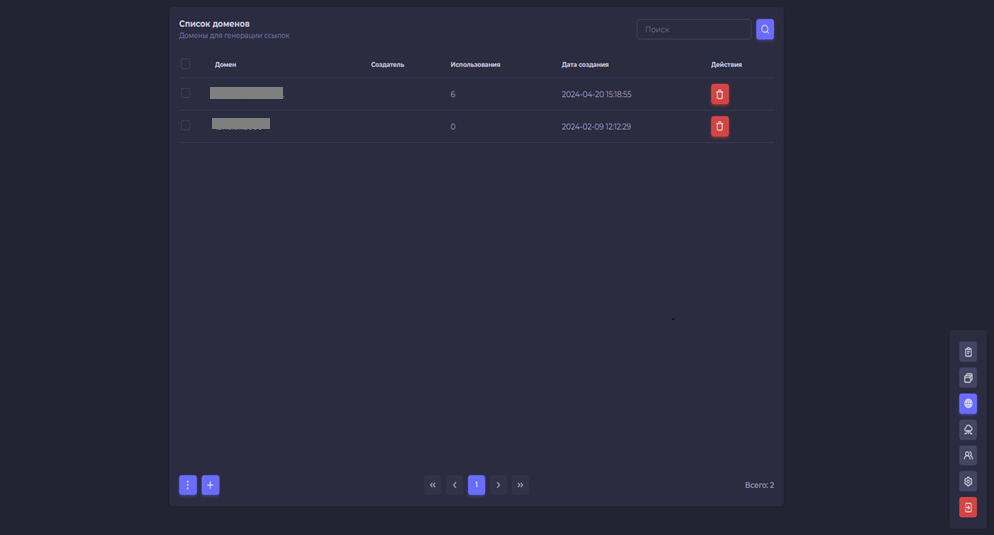 На этой странице пользователь панели видит список всех доменов, которые используются при создании фейковых шаблонов, может удалять домены или добавлять новые: