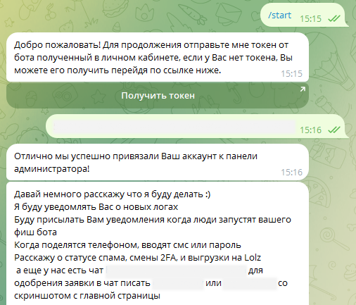 Кроме того, перед началом работы необходимо получить токен. Токен выдается Telegram-ботом для привязки аккаунта к панели администратора, чтобы отслеживать состояния логов и выставление их на продажу. Логом на языке воркеров называется файл украденной сессии.