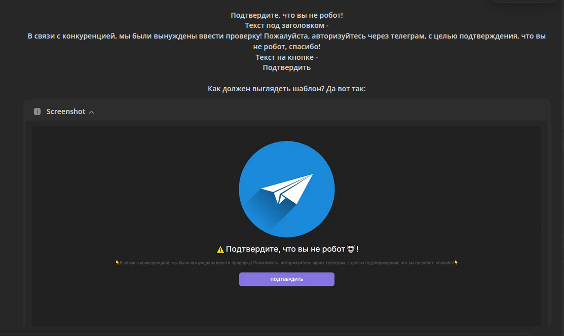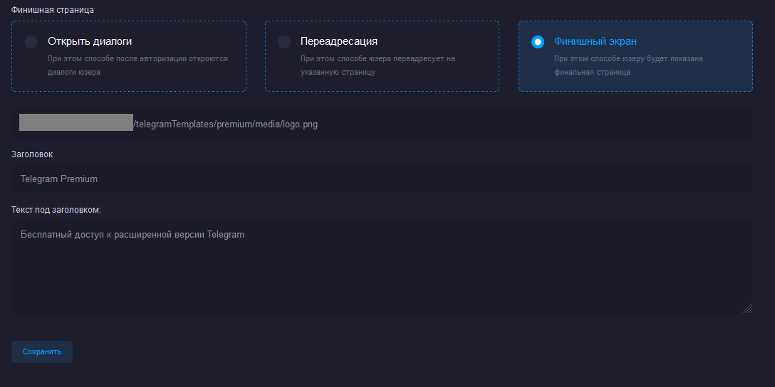 На финишной странице жертве можно показать его диалоги в Telegram, переадресовать на какой-либо другой ресурс или показать финальный экран, для которого в фейк-шаблоне можно также прописать все вводные.