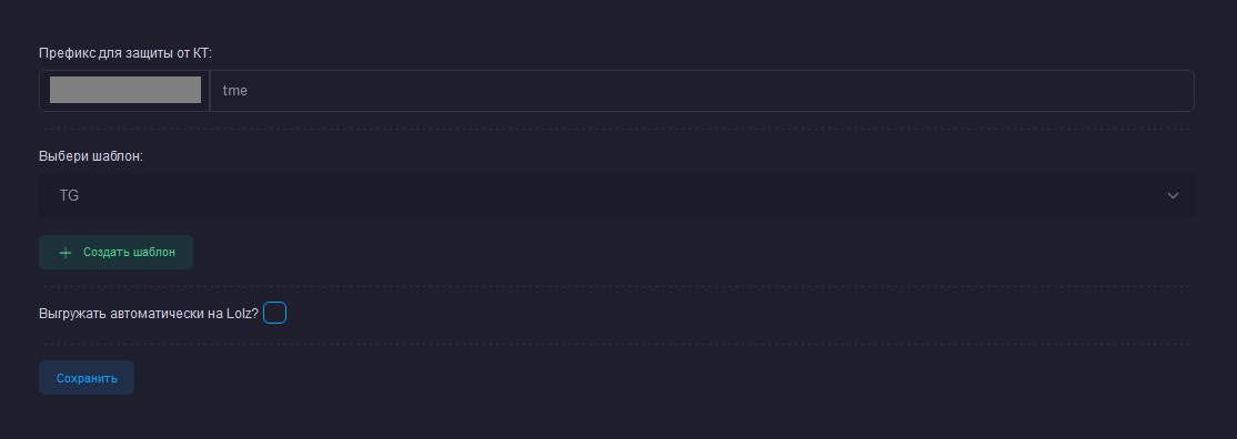 При создании фейка выбирается шаблон, который будет использован для обмана жертв; указывается путь, по которому будет открываться фишинговый ресурс (по умолчанию /tme), а также пользователь сразу может нажать галочку, чтобы все собранные логи выгружались автоматически на маркет форума.