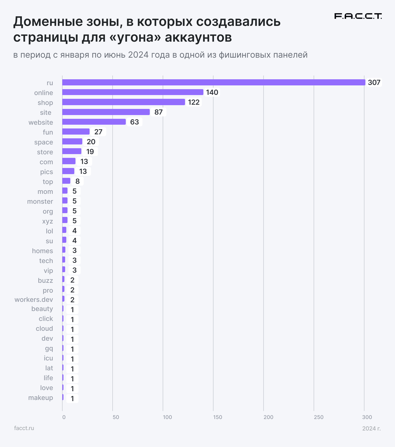Обнаружено более 900 фишинговых ресурсов, зарегистрированных в 2024 году и сделанных с помощью фишинговой панели SE (данные указаны на конец июня). Больше всего доменов было зарегистрировано в доменной зоне .ru — 307, на втором и третьем месте по популярности доменные зоны — .online и .shop. Наименование доменов часто содержит: «telegram», «premium», «auth», «tlg», «prem» и т.д. Многие свежие ресурсы доступны с добавлением пути «/tme», который в фейк-шаблоне прописывается по умолчанию.