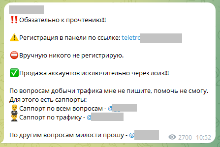 Автор другого мануала пишет о том, что самый прибыльный метод получения трафика — это реклама и рекомендует использовать всевозможные сервисы: форумы, Telegram-каналы, группы ВК, ютуб, инстаграм, твиттер и прочее. «Вы можете потратить много времени на то, чтобы найти нужный Вам трафик, но только представьте, если Вы сможете гнать около 500 логов взрослой аудитории каждый день стабильно 6 месяцев. Это в среднем Вам будет выходить в 125.000 рублей в сутки (т.к. взрослые тг акки стоят 250+ руб), за полгода РЕАЛЬНО можно будет заработать около ДВАДЦАТИ МИЛЛИОНОВ рублей.»