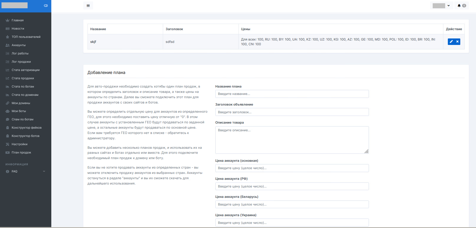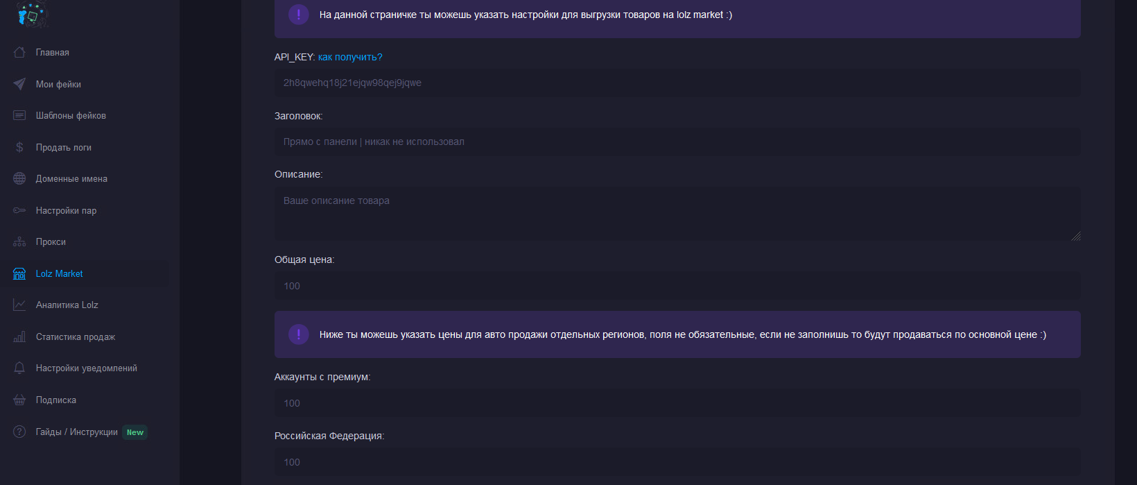 Во вкладке «Мои домены» воркер привязывает фейковый шаблон, который предварительно может создать в Конструкторе фейков, либо выбрать имеющийся из списка. Перед созданием фейка необходимо заполнить план продаж: установить стоимость аккаунтов, которые будут автоматически заливаться на маркет.