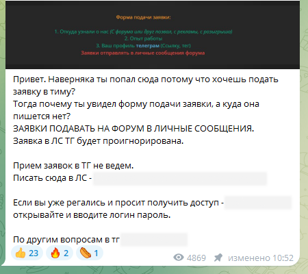 Панель SE была доступна бесплатно для любого пользователя, который подал заявку и получил одобрение на регистрацию. При этом заявка подается не «классическим» способом через Telegram-бота, а на теневом форуме, в личные сообщения пользователю. В заявке требуется ответить на три простых вопроса: