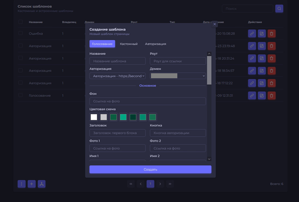 В панели предусмотрено два шаблона фишинговых страниц «Официальное превью» и «Старый шаблон». Каждый шаблон состоит из двух частей: приветственной и финишной страницы. Пользователю остается только наполнить их контентом: добавить текст, изображения. Шаблон можно кастомизировать под определенную тематику. Шаблонов можно создавать неограниченное количество.