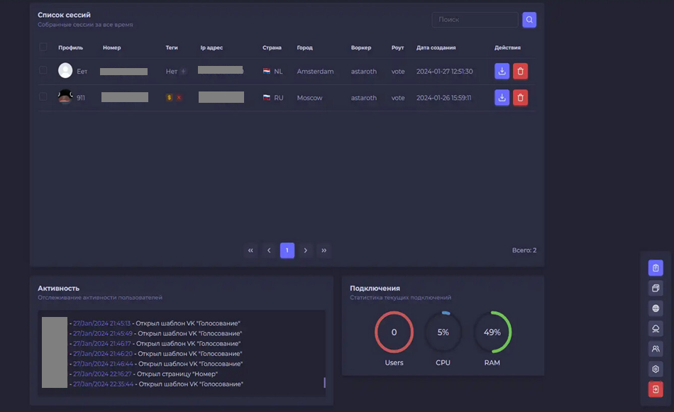 На главной странице доступен список всех украденных сессий с информацией о профиле, номере телефона, ip-адресе, стране, дате создания. На этом же экране пользователи панели отслеживают активность жертвы: каждый раз, когда жертва открывает фишинговый ресурс и вводит данные, об этом появляется отбивка в системе в разделе «Активность».