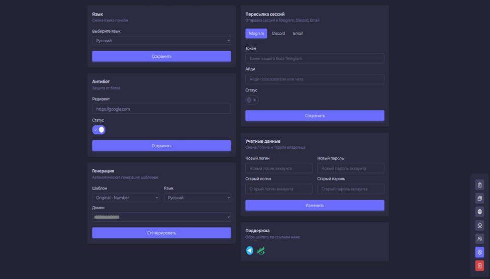Веб-панель работает на нескольких языках: английский, русский, украинский, белорусский, китайский. Можно настроить отправку уведомлений о новых сессиях в Telegram, Discord или на почту.