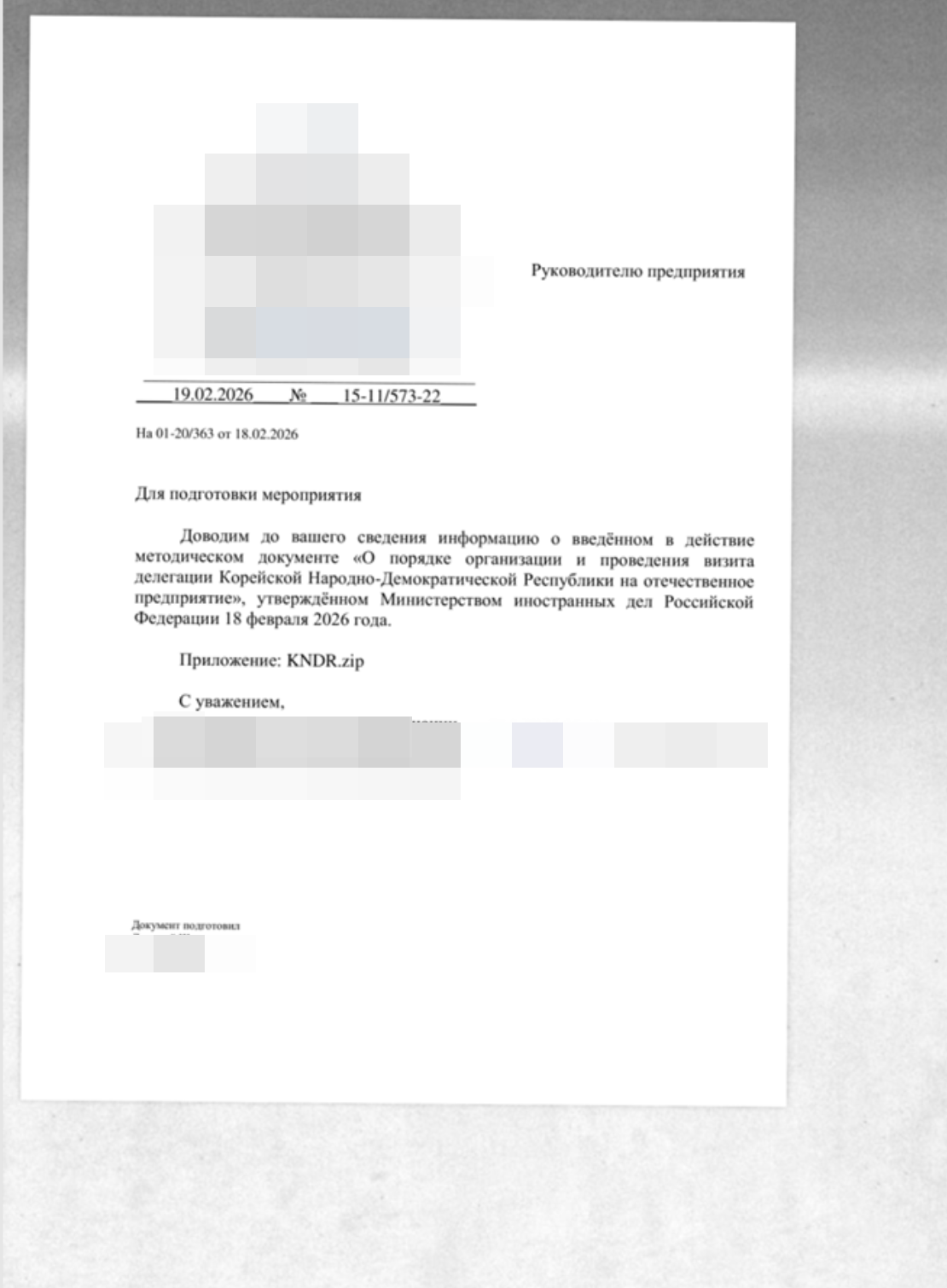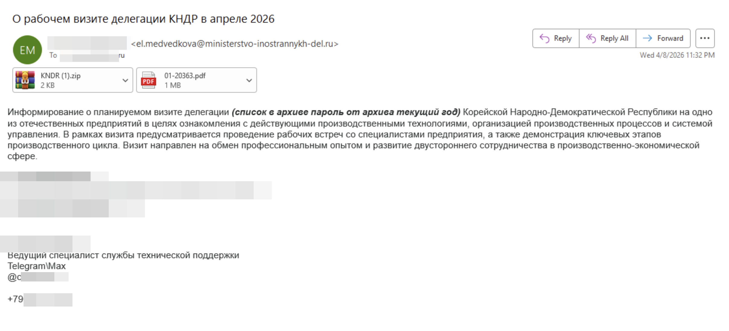 Фишинговые письма с темой «О рабочем визите делегации КНДР в апреле 2026» были направлены с электронного почтового ящика «el.medvedkova@ministerstvo-inostrannykh-del[.]ru» (домен зарегистрирован 30 марта 2026 года) на различные адреса целевой компании.