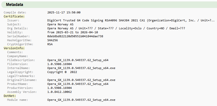 Исполняемый файл подписан недействительной подписью c именем Opera Norway AS.