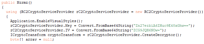 В ходе выполнения файл дешифрует и запускает в памяти сохраненный в ресурсах файл с именем Efrhk путем использования алгоритма дешифрования RC2.