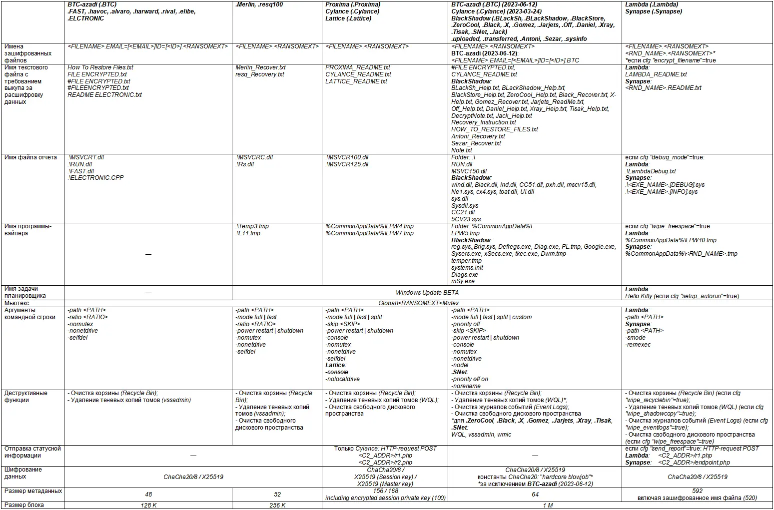 Семейство шифровальщиков Proxima объединяет множество программ-вымогателей, которые на первый взгляд кажутся не связанными друг с другом. Сейчас Proxima разрослось до 5 подсемейств: BTC-azadi, Merlin/resq, Cylance, BlackShadow и Lambda/Synapse (рис. 6). Несомненно, все подсемейства имеют в прародителях одни и те же исходные коды программы-вымогателя. Подробно о подсемействе BlackShadow мы рассказывали в нашем блоге.