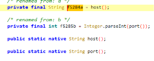 2. Для сокрытия соединения с сервером функции вызова сетевых параметров соединения (IP-адрес сервера злоумышленников и его порт) перемещены из Java-кода в Native-библиотеку приложения.