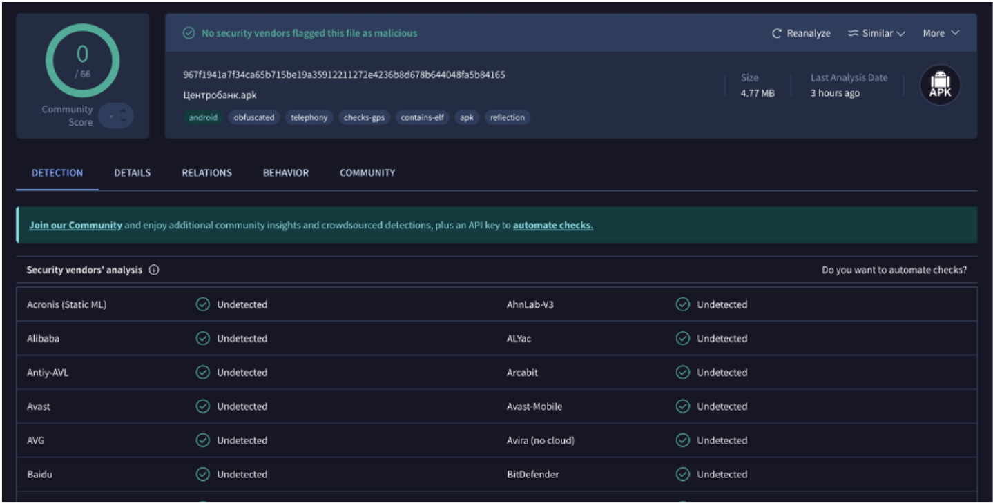Комбинация этих техник приводит к тому, что эффективность выявления «обратной» версии ВПО антивирусными решениями значительно снижена. Мы проверили несколько образцов «обратного» NFCGate на VirusTotal и ни в одном из них антивирусные решения не заметили ничего подозрительного.