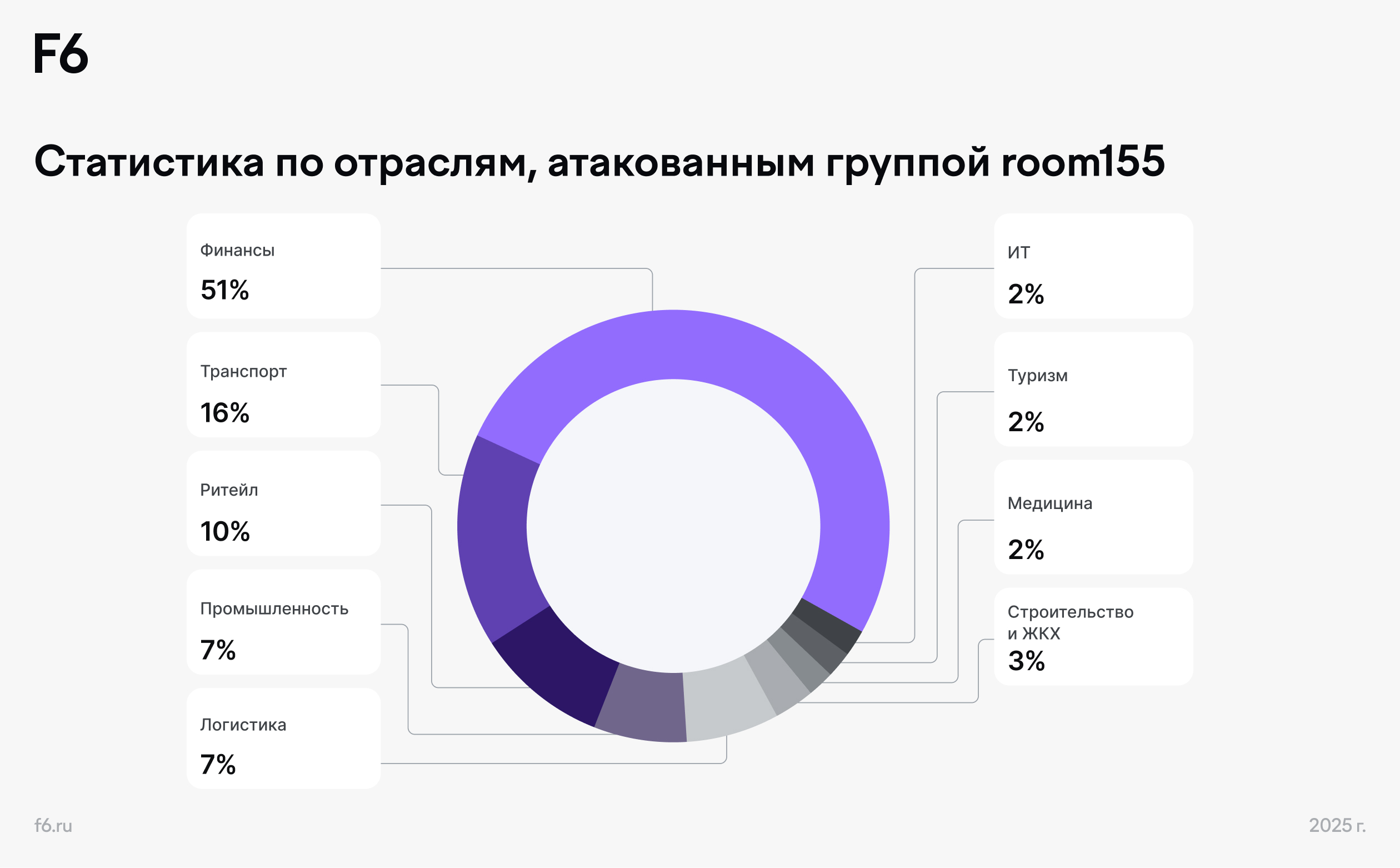 Основные цели room155, по итогам анализа вредоносных рассылок – финансовые организации (51%). Далее в списке – компании сферы транспорта (16%), ритейла (10%), промышленности и логистики (по 7%), строительства и ЖКХ (3%), медицины, туризма и IT (по 2%).