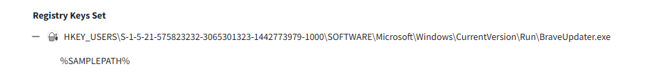 Образец Revenge RAT закрепляется в системе с помощью модификации раздела реестра Run, создавая значение BraveUpdater.exe: HKCU\Software\Microsoft\Windows\CurrentVersion\Run\BraveUpdater.exe