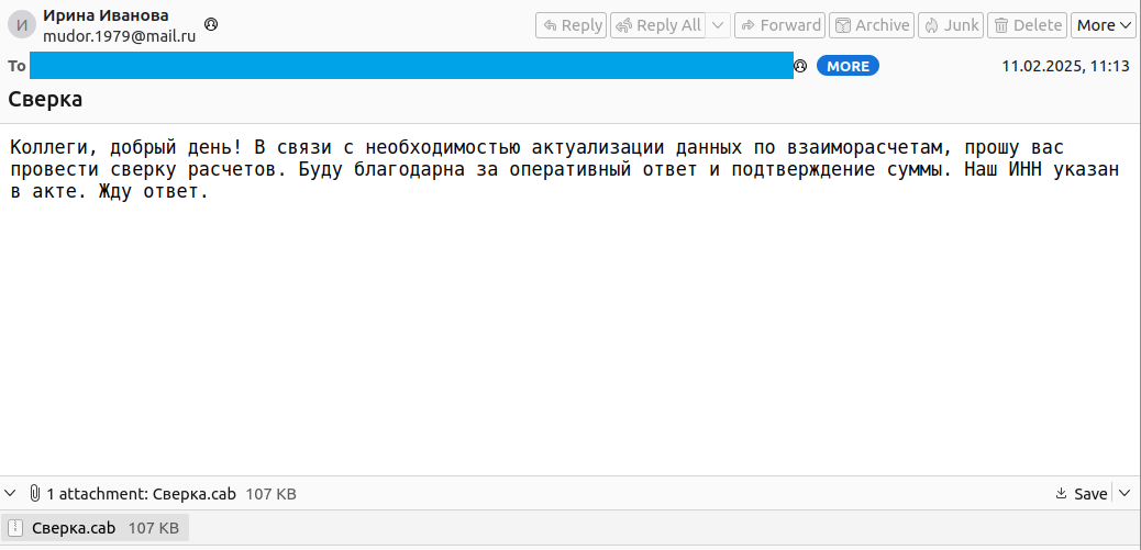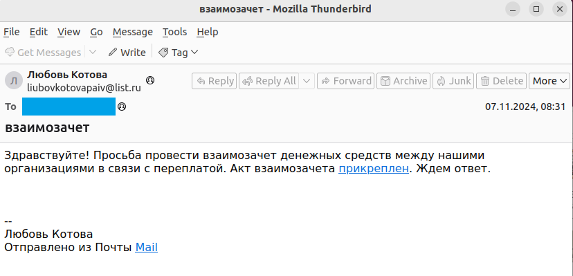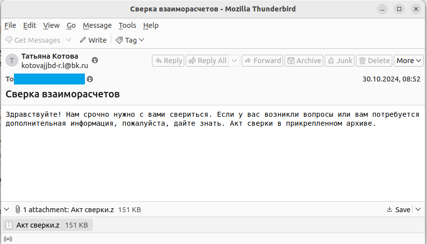 В конце 2023 года стали появляться посты от жертв, чьи организации были зашифрованы после запуска вредоносных вложений из писем с темами «Акт сверки» (рисунки ниже).