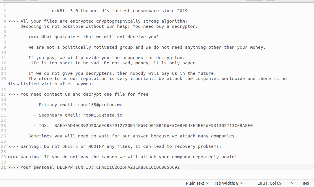 Оказалось, что злоумышленники шифруют устройства жертв с помощью шифровальщика LockBit 3 Black. Группа не имеет своего сайта утечек (DLS). Общение проходит по почте либо с помощью Tox-чата. Злоумышленники указывали следующие контакты для связи: