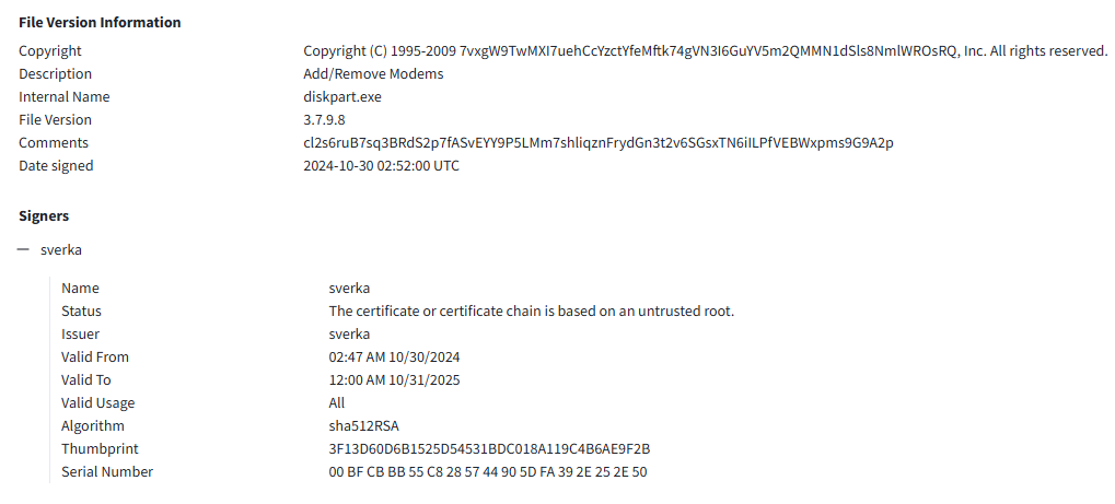 Образец XWorm (MD5: a2bd3c567dde86e5876190c9089c2902) подписан следующим X.509 сертификатом: