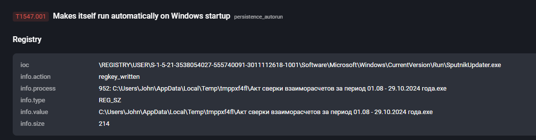 Здесь можно заметить, что у файла 2868.tmp.exe двойное расширение, такая же подпись и Company Name, как и у образца XWorm выше. Видим значение BraveUpdater.exe в ключе реестра, использование омоглифов в «Aкт cвepки взaимopacчeтoв за период 01.09.2023 — 21.11.2023 года.exe». Признаки указывают на то, что активностью стоит одна и та же группа — room155.