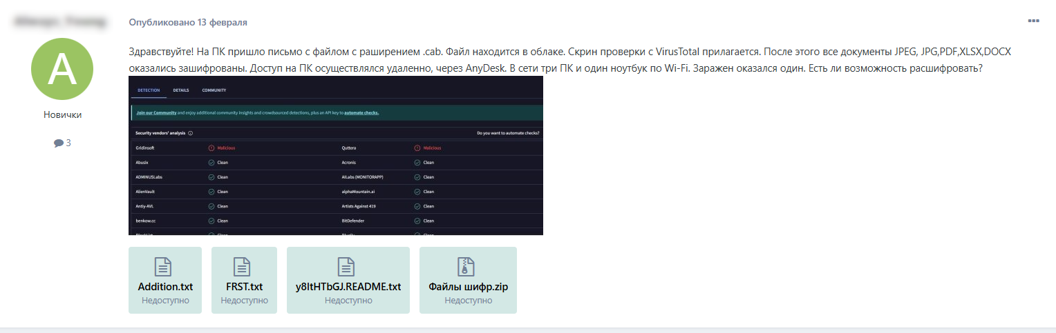 В конце января-начале февраля 2023 года на одном из форумов появляются посты жертв атак, которые мы атрибутируем группе room155, с просьбой о расшифровке. Согласно этим сообщениям, группа рассылала письма от имени ФССП. Примеры сообщений представлены на рисунках ниже.