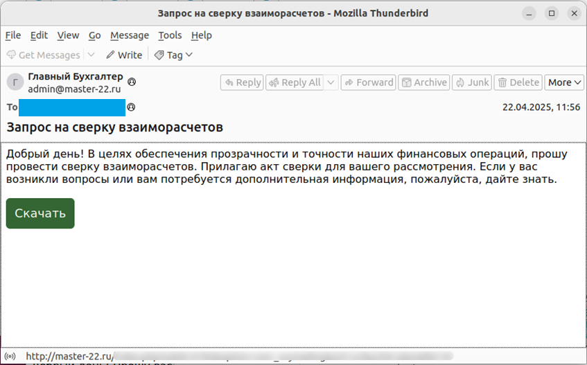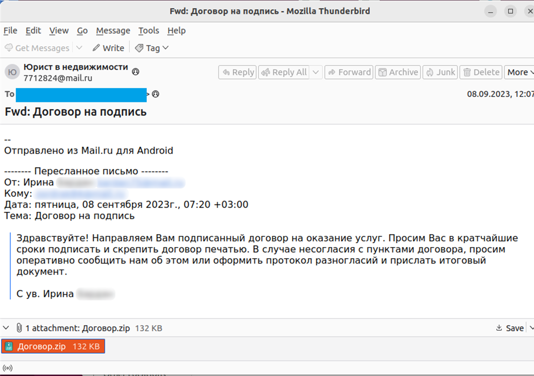 Специалисты F6 обнаружили письмо с темой «Договор на подпись», отправленное одному из клиентов в сфере пищевой промышленности, в сентябре 2023 года.
